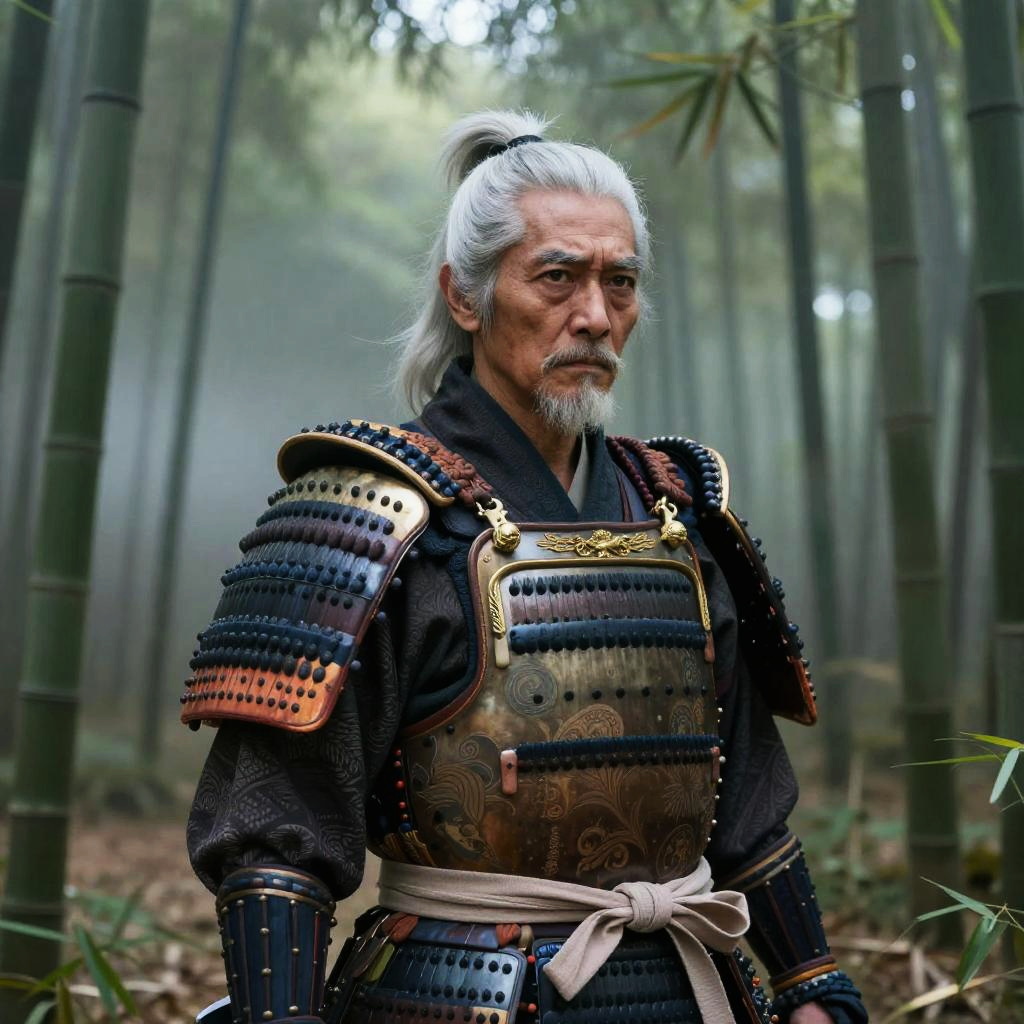 Old man with ponytail wearing traditional samurai armor, standing in a misty bamboo forest, intense gaze, intricate patterns on armor, dramatic lighting and shadow play