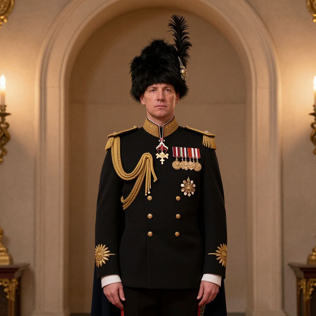 Photograph of a middle-aged white man standing in an ornate, warmly lit room with arched walls. He wears a formal black military uniform adorned with gold epaulettes, intricate gold embroidery, and multiple colorful military medals. A black fez with a feather sits atop his head. His expression is neutral, and he stands with a straight posture. The background features two lit wall sconces and elegant wooden furniture. The overall style is regal and formal, emphasizing military honor and tradition.