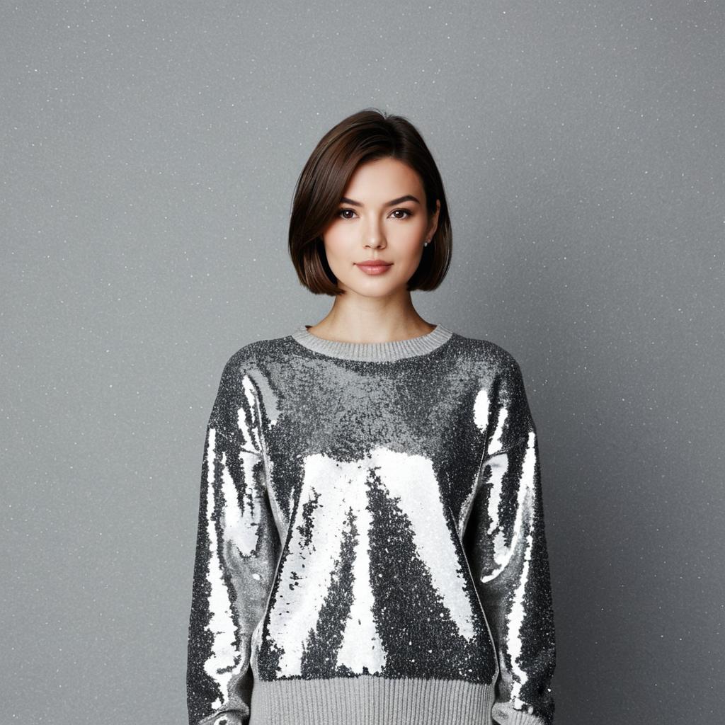 Photorealistic portrait of a young woman with short straight brown hair wearing a silver shimmering sequin sweater with long sleeves. She stands against a minimalist gray background with sparkling effects, looking directly at the camera with a neutral expression. The image is well-lit with natural daytime light, highlighting the modern and elegant casual fashion style.