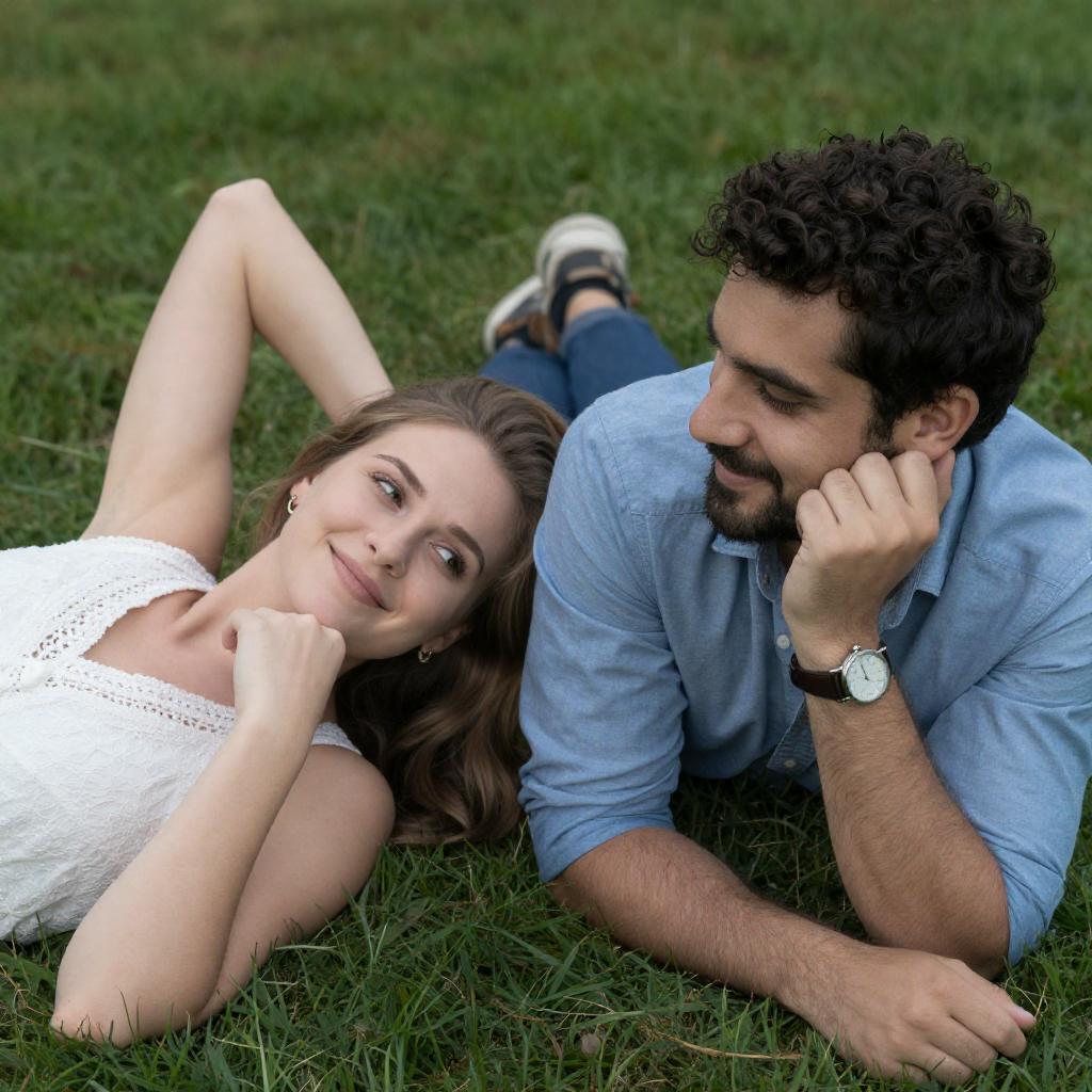 Photograph of a man and woman sitting outdoors on a grassy hill. Man with dark beard, grey long-sleeve shirt, black cap, right hand on knee. Woman with blonde hair, light blue shirt, holding a plate, looking forward. Background: grassy slope, blurred people sitting and standing. Bright daylight, casual attire, relaxed atmosphere.