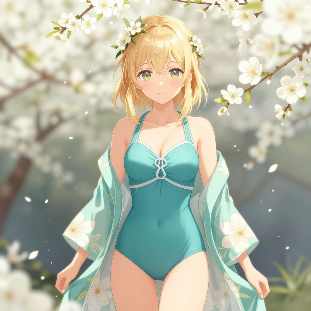 Digital artwork of an anime-style young woman with short blonde hair and green eyes, wearing a yellow jacket over a pink and yellow bikini. She is posed confidently on a city street with modern buildings in the background.