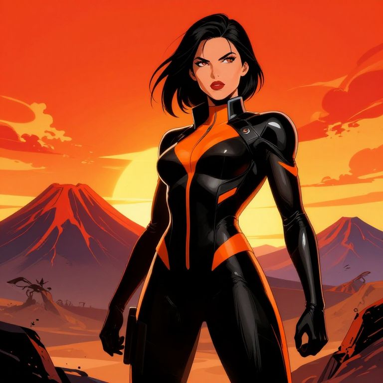 This digital illustration features a confident, dark-haired woman in a tight, black and orange, form-fitting bodysuit with high collar and zipper. She stands in a dramatic, volcanic landscape at sunset, with two red-hued mountains and a fiery orange sky in the background. Her red lipstick contrasts with her serious expression. The bodysuit has glossy textures, highlighting her athletic build and medium-sized breasts. Her stance is strong and commanding, with her arms slightly bent at the elbows. The style is reminiscent of comic book art, with bold colors and sharp lines.