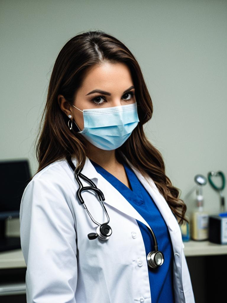 White lab coat costume, 1girl, solo, stethoscope, realistic, brown hair, photorealistic, earrings, jewelry, long hair, doctor, looking at viewer, lab coat, lips, mask