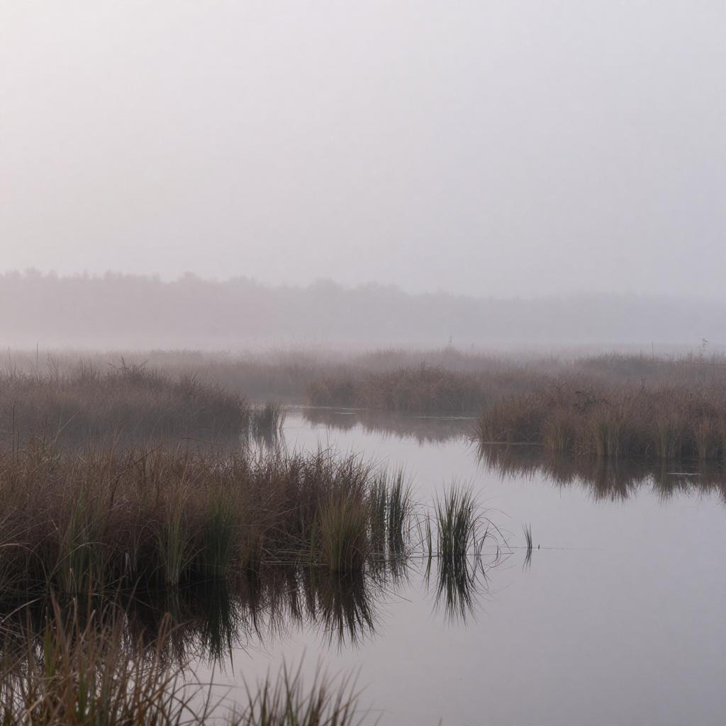 A peaceful marshland landscape enveloped in thick fog, featuring soft muted greys and whites with subtle misty lavender hues. Tall grasses and reeds rise gently from calm, reflective water, creating a tranquil and ethereal atmosphere with delicate silhouettes fading into the foggy background.