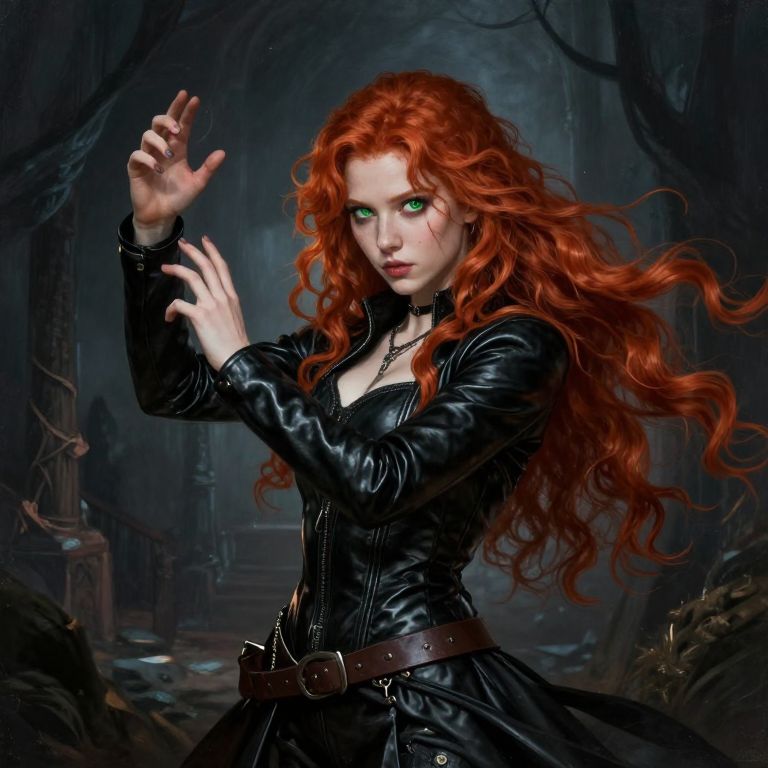 Digital painting of a fierce, red-haired woman with green eyes, in a black leather dress, casting a spell in a dark, eerie forest.