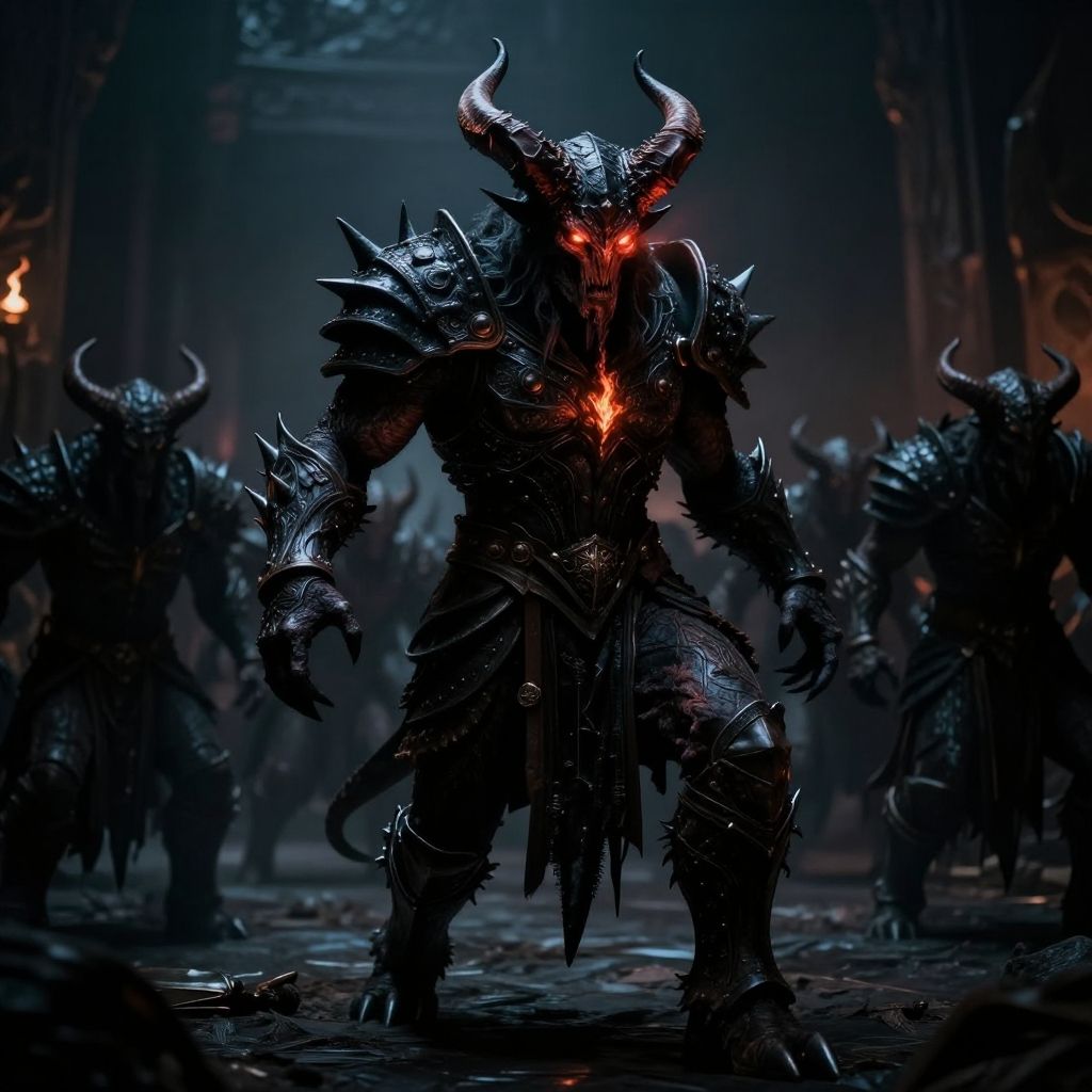 ((cinemtic shoot)) ((fantasy)), ((rpg)), ((focus on character)), full body shoot, photo of The Demonic Warlord - A towering, horned behemoth clad in spiked, obsidian armor, his eyes burning with unholy fire as he leads his demonic horde to lay waste to all in their path., dynamic expression, intricated skin, realistic, ((photorealistic)) rim lights, dark shadows, cinematic scene, movie shoot, dark, extremely detailed, hard light hard shadows, shallow depth of field, vignette, highly detailed, high budget Hollywood film, cinemascope, moody, epic, gorgeous, detailed background, ((darkfull )), detailed, SK_ANALOGFILM