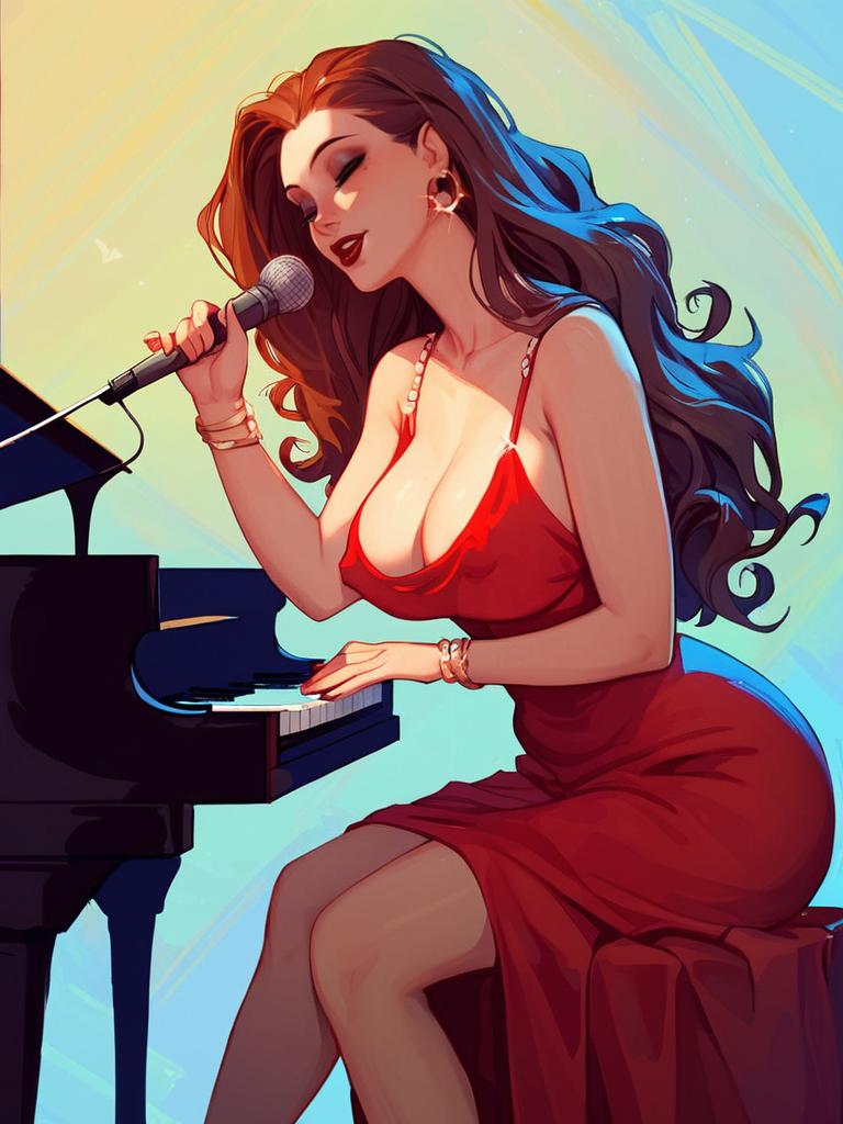Digital illustration of a woman with long brown hair wearing a glamorous red dress and sparkling jewelry. She is sitting at a grand piano, holding a microphone and singing, with eyeshadow and red lipstick enhancing her makeup. The image conveys a sophisticated musical performance scene.