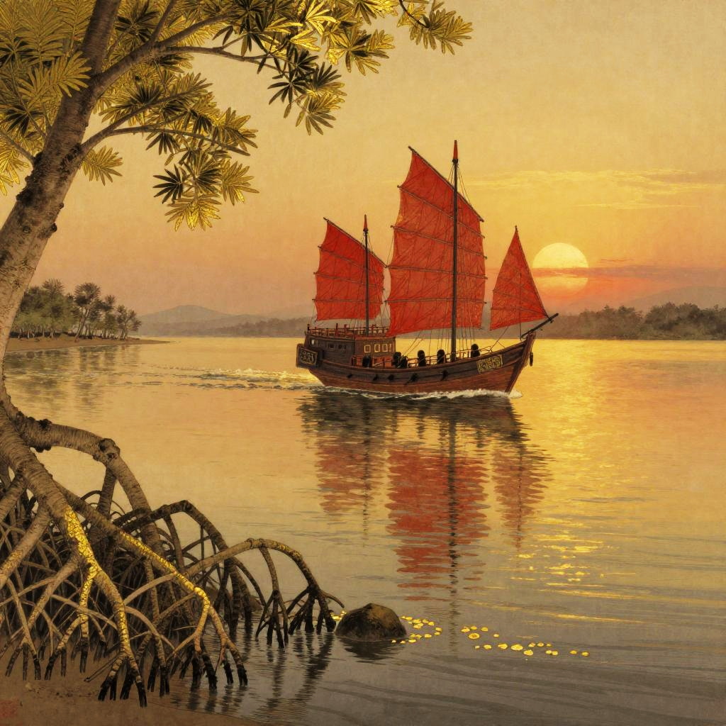 Dreamlike Bioluminescent Coastal Catamaran Sunset