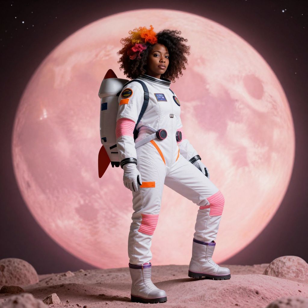 In this captivating image, a black woman with voluminous, curly hair styled to resemble a rocket stands confidently on a celestial body, likely the moon, given the pinkish hue of the surroundings. She is dressed in a futuristic space suit, complete with a backpack and various patches, exuding a sense of adventure and exploration. Her attire is predominantly white, with accents of orange and pink, complementing the vibrant colors of her hair and the background. The woman's pose is dynamic, with one leg bent and the other extended, as if she is in mid-step, adding a sense of movement to the scene. The background features a large, round object with a gradient of pink and orange hues, resembling a planet or moon, further enhancing the otherworldly atmosphere. The overall composition is balanced, with the woman centrally positioned, her hair and the background elements creating a harmonious visual narrative.