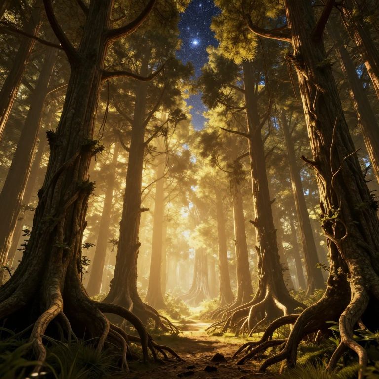 Photograph of a magical forest at dawn, with golden sunlight filtering through tall trees, revealing intricate roots and a starlit sky above.