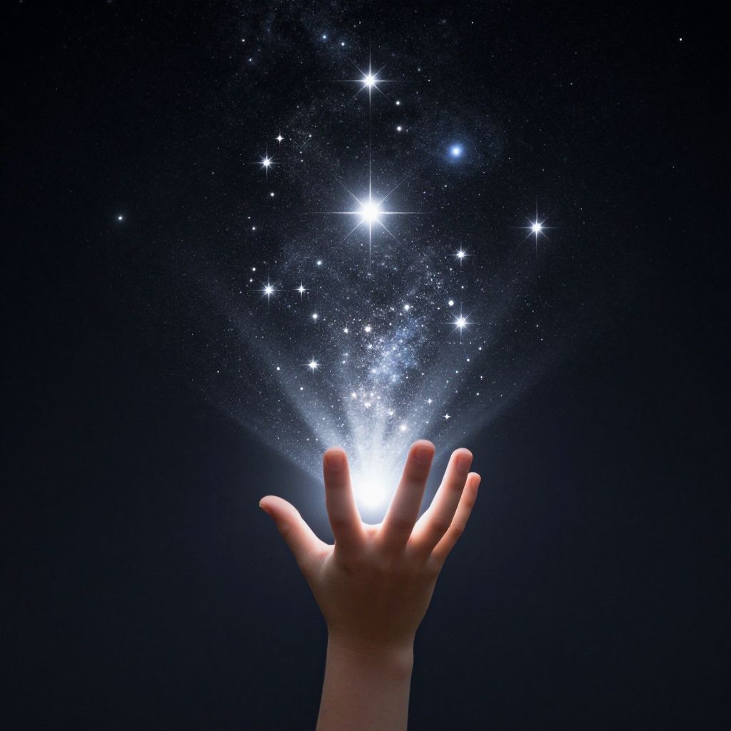 A child's outstretched hand reaches toward the cosmos, igniting a celestial cascade of starlight that whispers of boundless wonder, hope, and the eternal dance between creation and dissolution.