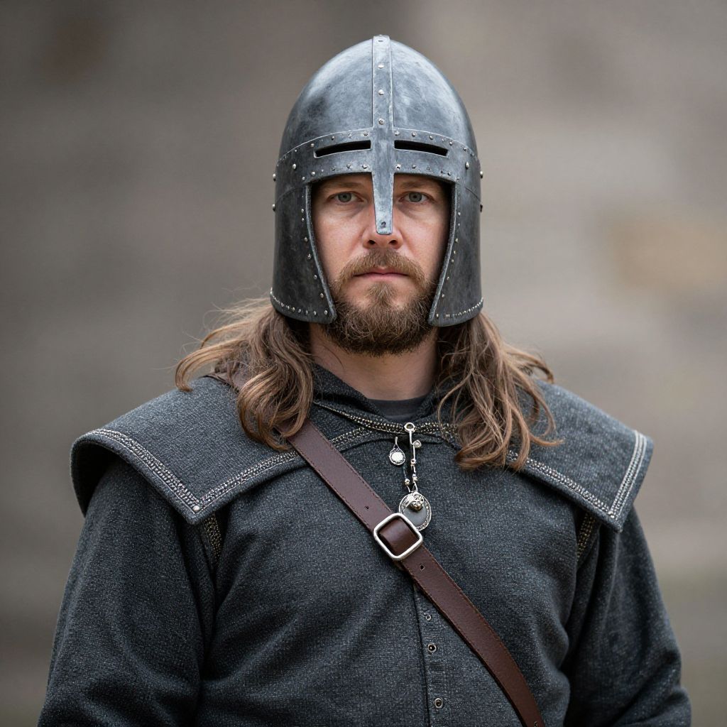 Photograph of a Caucasian man with long brown hair and a beard, wearing a black medieval-style iron helmet with a nasal guard. He has a serious expression and blue eyes. He is dressed in a dark grey, textured, woolen tunic with white stitching along the shoulders. A brown leather strap with a metal buckle crosses his chest. The background is blurred, featuring a stone wall, suggesting an outdoor medieval setting. The image has a realistic and detailed style, emphasizing historical attire and medieval warrior aesthetics.