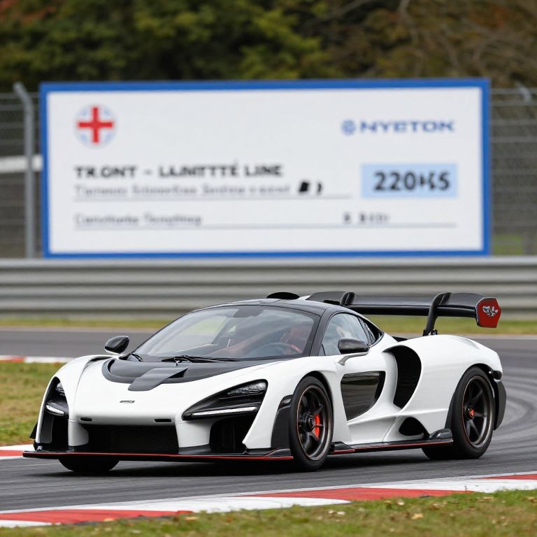 Photograph of a black and white, high-performance sports car with a sleek, aerodynamic design and a large rear spoiler, racing on a track with red and white curbs. The car has black accents, red brake calipers, and low-profile tires. In the background, there's a large white billboard with black and red text, partially blurred. The billboard has a red cross symbol, the text "FK CONT - LANGETT LINE," and a phone number. The track is bordered by a metal fence and green grass. The car is positioned slightly to the left, moving towards the right.