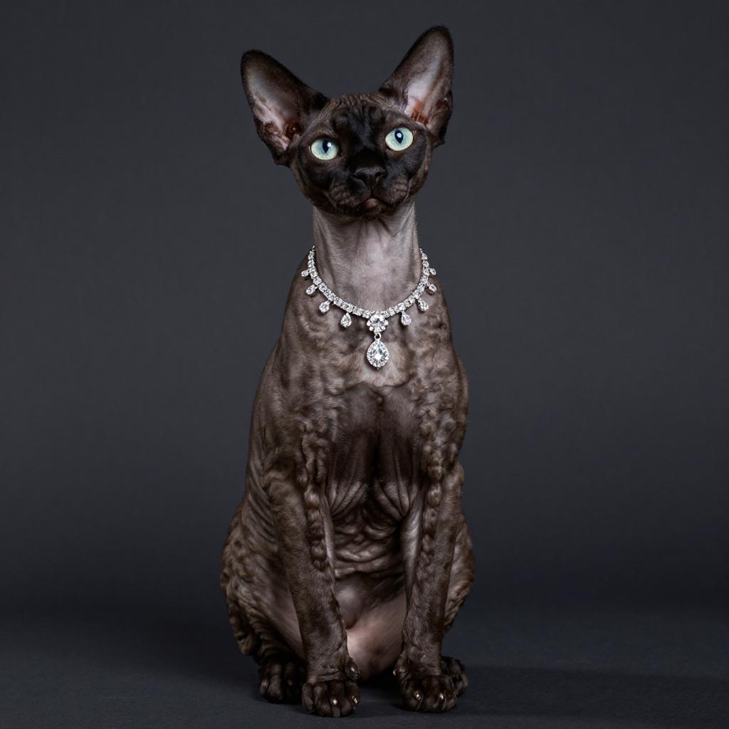 Luxurious studio portrait of a Sphynx cat sitting upright, glossy dark fur, wearing an ornate sparkling diamond necklace, clean dark background with spotlight, high-end fashion pet photography, high resolution, ultra-detailed
