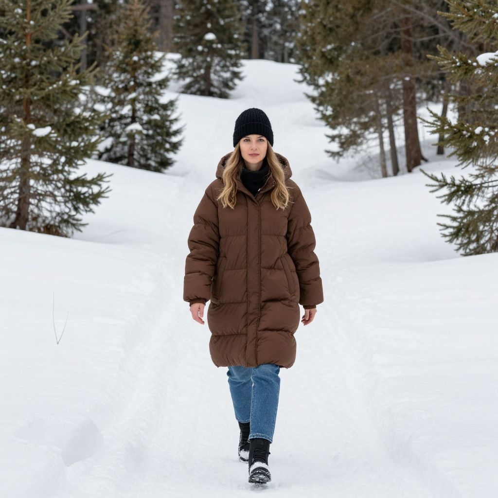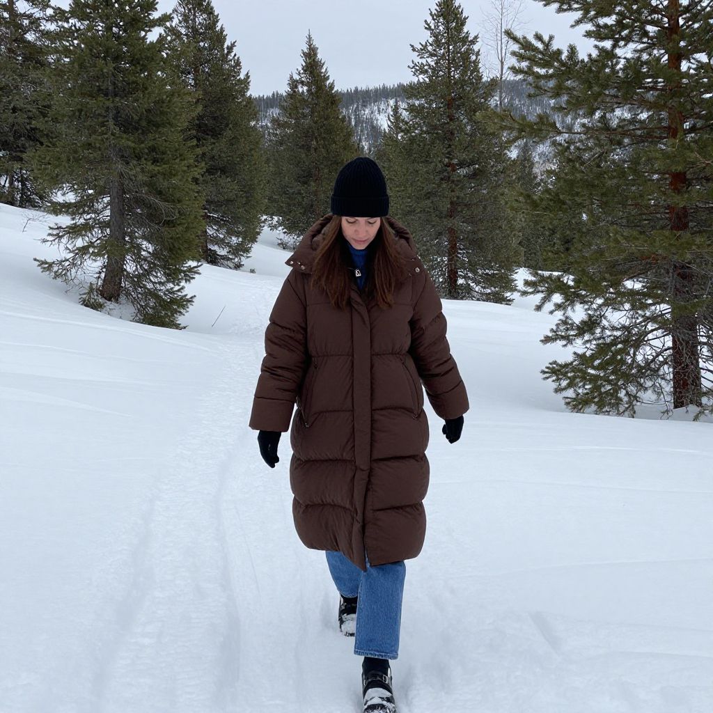 Winter scene captures a woman in Lake Arrowhead, bundled in a brown puffer coat, black knit hat, and blue jeans, walking through a snowy landscape dotted with evergreen trees and faint ski tracks, embodying a cozy yet stylish winter aesthetic.