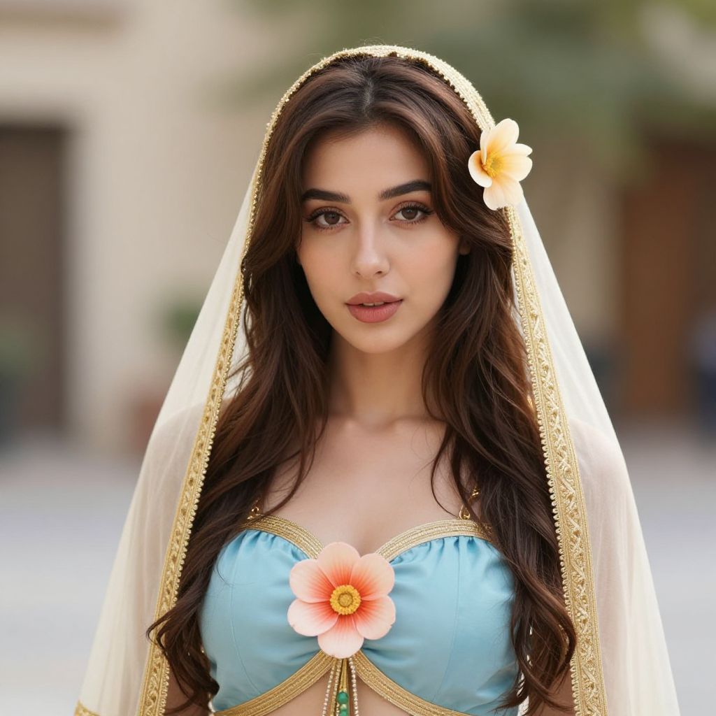 "arabian outfit woman costume, 1girl, solo, upper body, flower, brown hair, looking at viewer, long hair, veil, blurry, day Realistic photo of casual sexy person with pretty face"