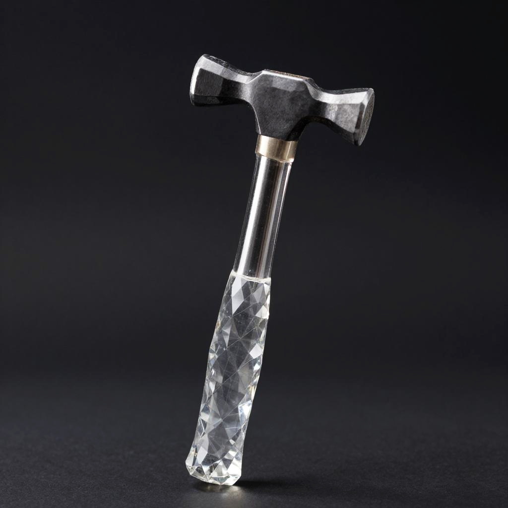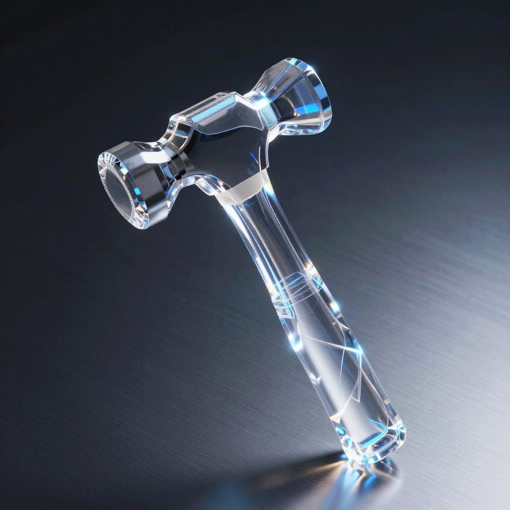 Hammer transparent, a minimalist transparent hammer icon rendered in 3D with soft shadows, subtle reflections, and clear edges, set on a clean white background, perfect for modern UI or graphic design, sleek and elegant composition
