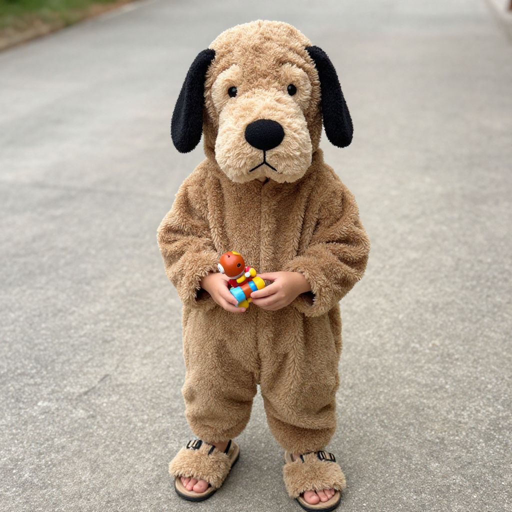 Person in Brown Dog Costume Holding Toy
