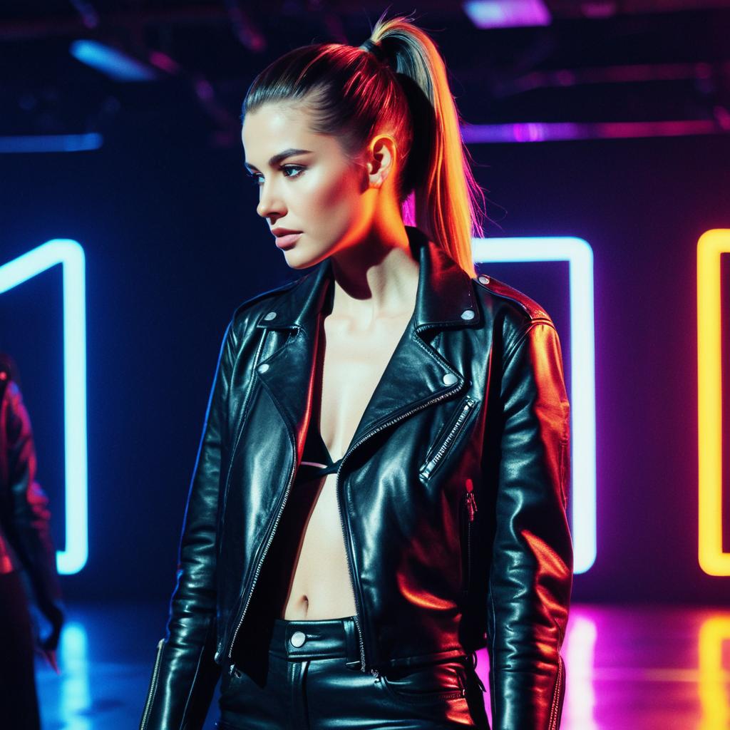 High Ponytail hairstyle on fashion model, wearing leather jacket and pants, in runway, captured in fashion editorial style with vibrant neon lights.