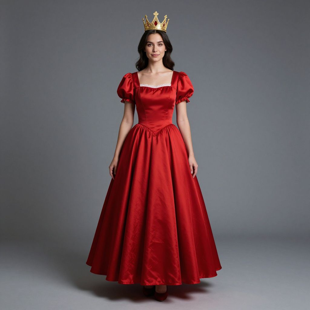 Photograph of a young woman with long, dark wavy hair, wearing a gold crown and a floor-length, red satin gown with puffed short sleeves. The dress has a square neckline and a fitted bodice that flares out into a full skirt. She stands against a plain, gray background, smiling slightly. The red of the dress contrasts with her fair skin and dark hair, and the gold crown adds a regal touch. The overall style is reminiscent of a fairy tale princess, with a modern, studio photography aesthetic.
