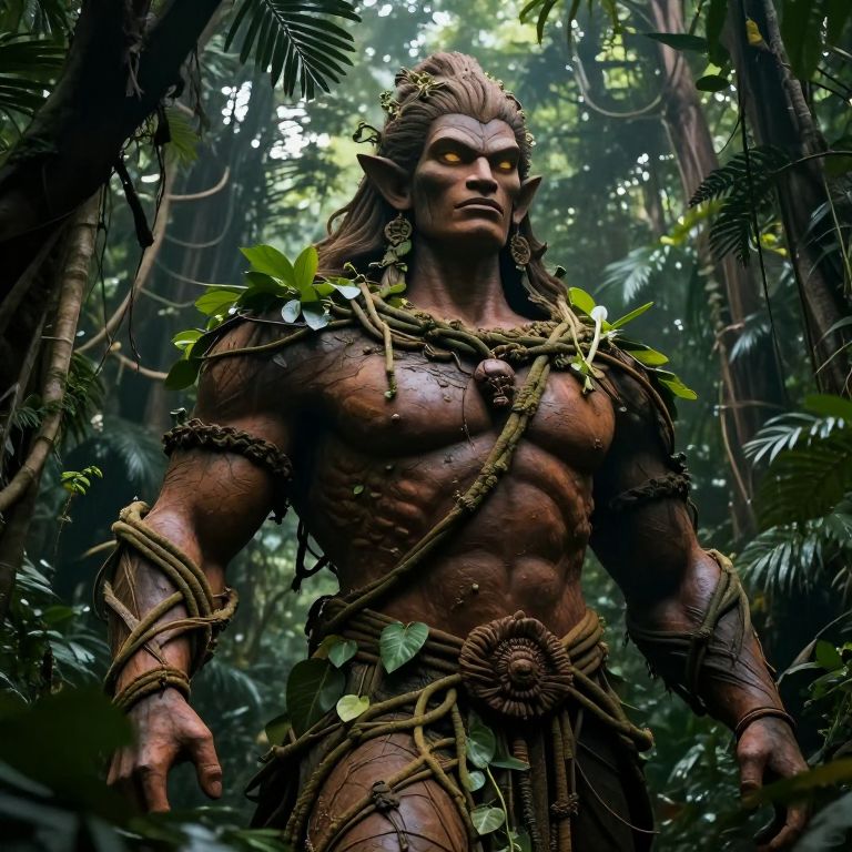 Majestic kaax spirit depicted as a towering figure blending with jungle elements, lush vines and leaves entwined around muscular form, glowing eyes, serene expression, rich earthy tones, cinematic lighting emphasizing mystery and power