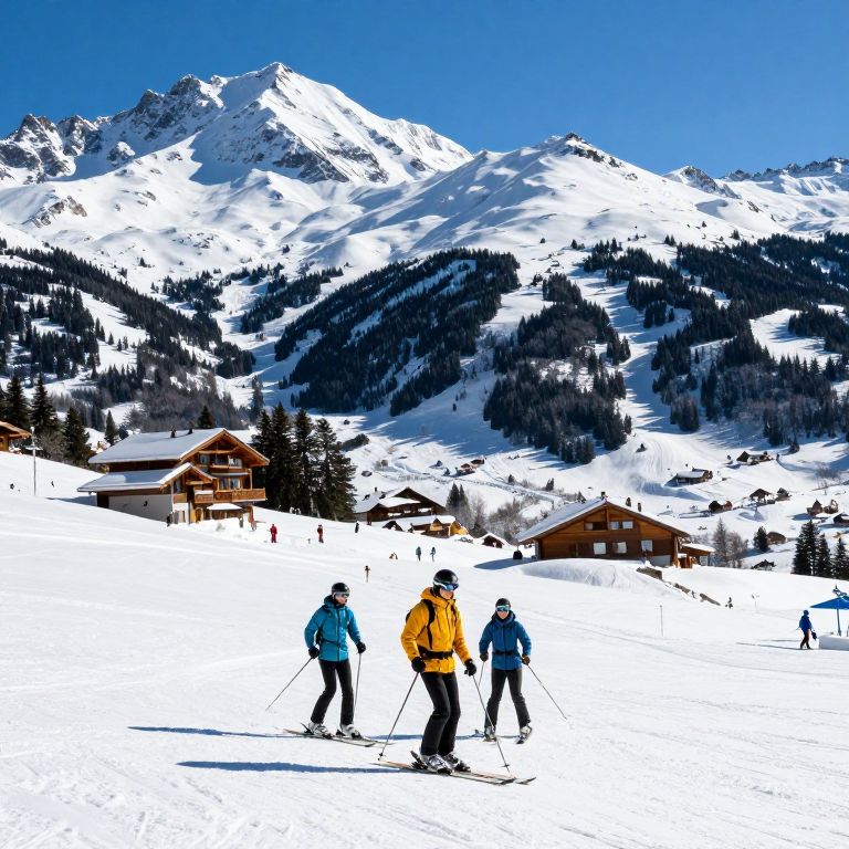 Photograph of three skiers in bright jackets, blue and yellow, standing on snowy mountain slope with mountain chalets and towering peaks in the background,