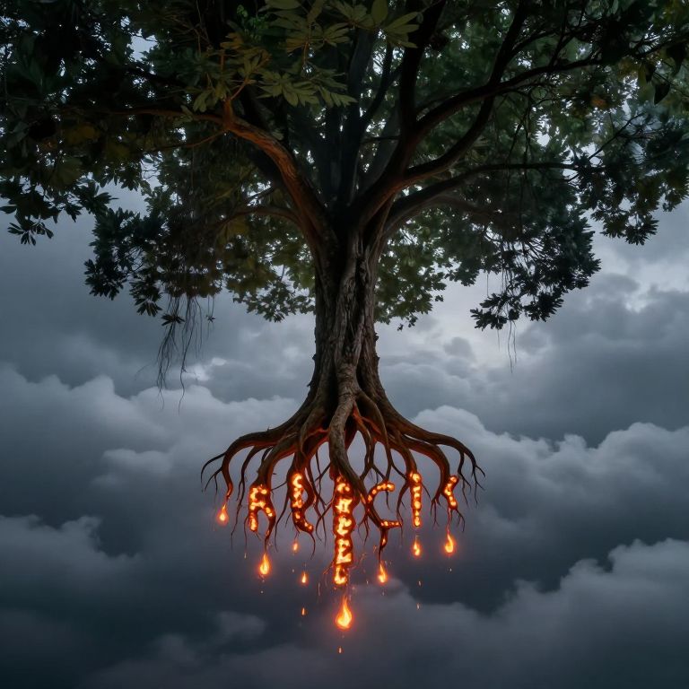 Trees grow upside-down from the clouds, their roots raining glowing embers shaped like forgotten words.