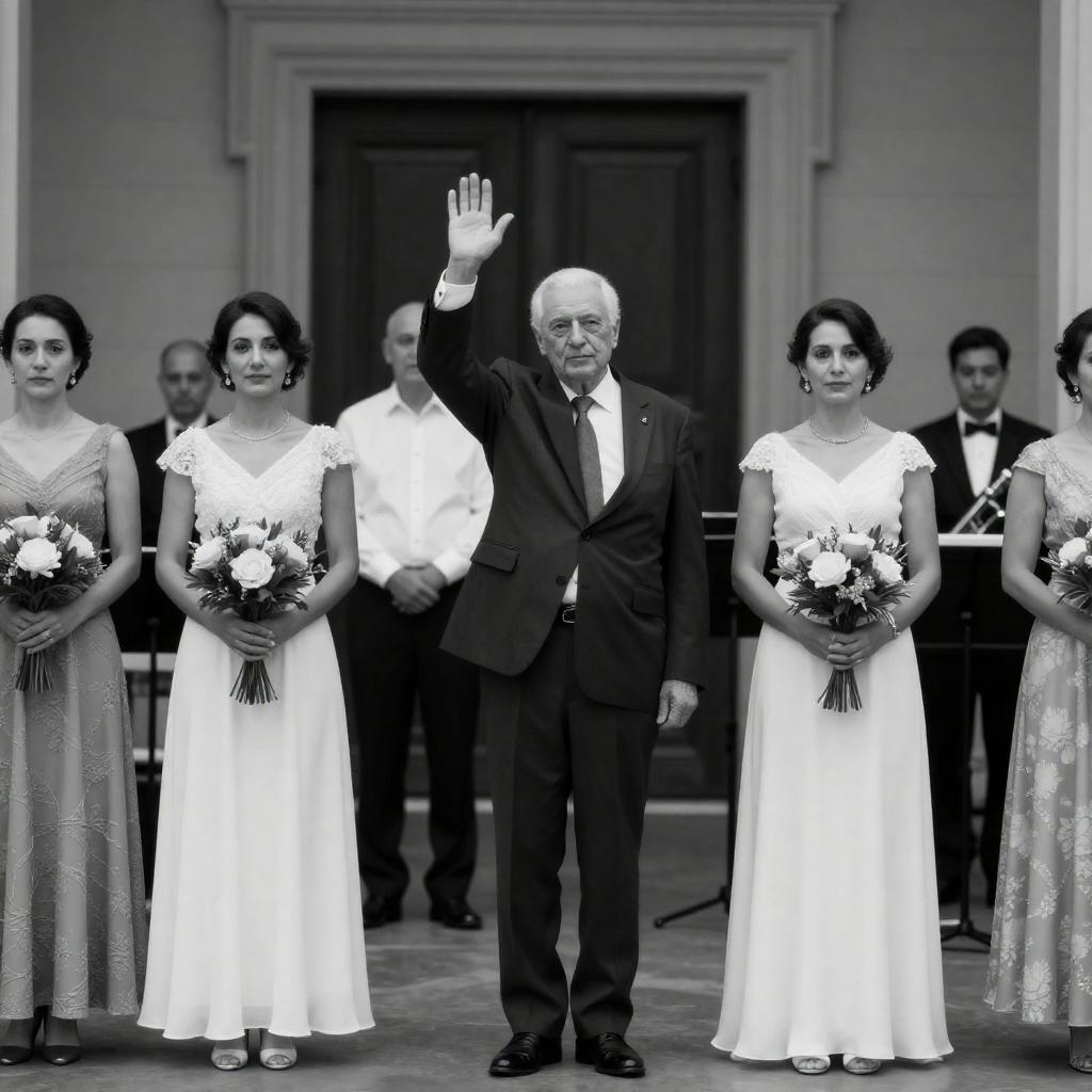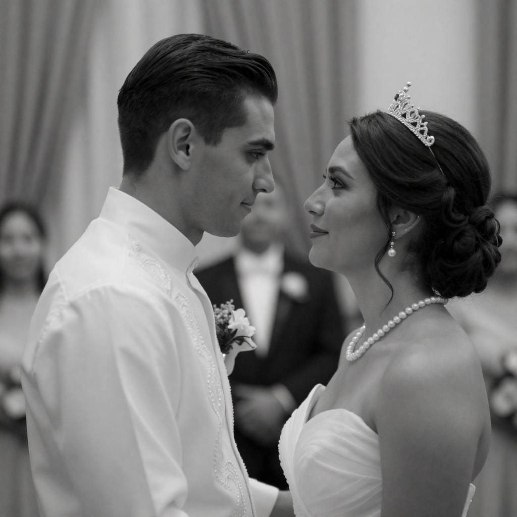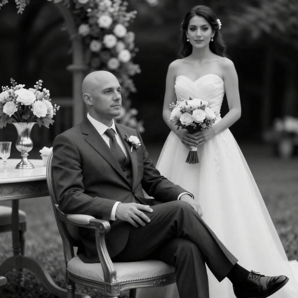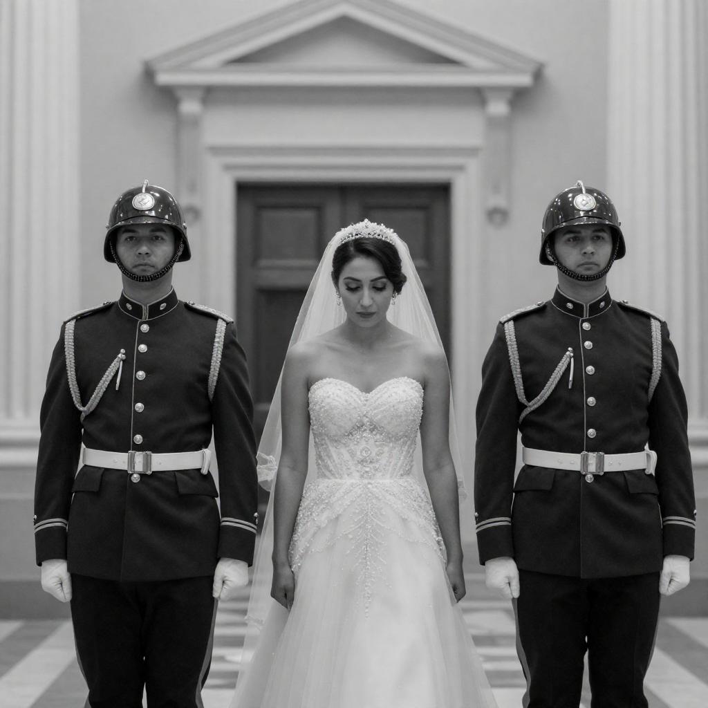 Black-and-white photograph of a bride in a strapless, beaded gown with a veil, walking between two armed guards in ornate uniforms with helmets, in a grand, columned hall. The guards stand on either side, creating a protective escort.