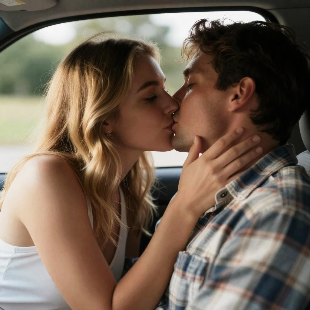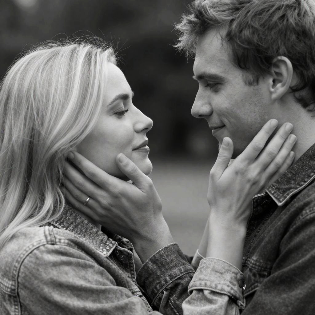 Black-and-white photograph of a close-up, intimate moment between a blonde woman and a man. Woman, left, gently holds man's face with both hands, eyes closed, looking up. Man, right, gazes down at her, slight smile. Both wearing denim jackets. Blurred background. Woman's hair is shoulder-length, man's hair short and slightly tousled.