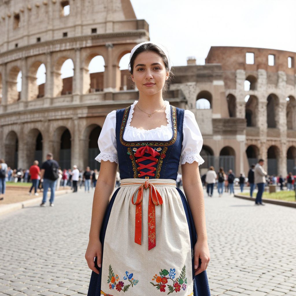 Photograph of a young woman standing in front of the Colosseum in Rome. She's wearing a traditional Bavarian-style dress with a dark blue bodice, white lace cuffs, and a cream apron adorned with colorful embroidery. She has a white headscarf, and her dark hair is visible underneath. The background features the Colosseum with tourists milling about. The cobblestone ground adds texture to the scene.