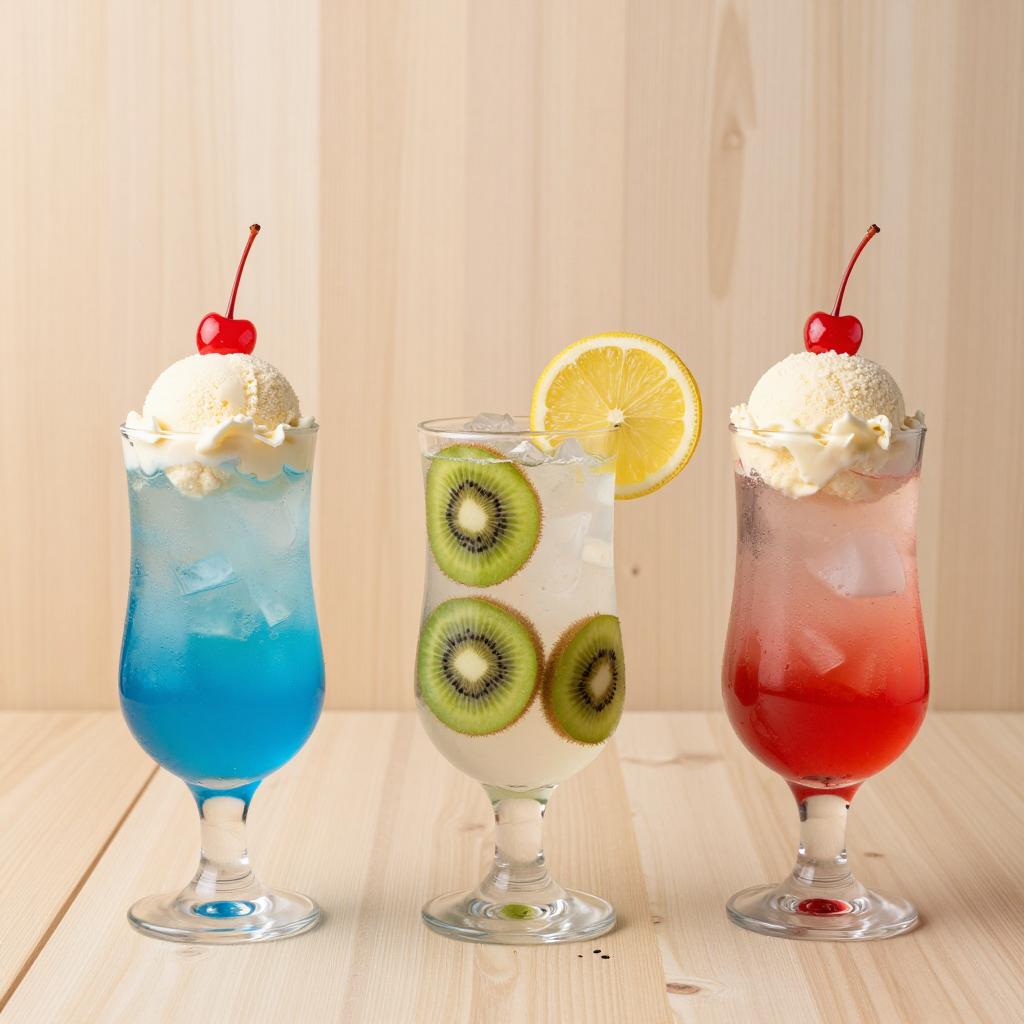 Glass dessert cup filled with colorful sugar cubes, green, blue, yellow, purple, and pink. Two sliced bananas on top, cherry with stem, spoon on white table. Bright, vibrant colors, sparkling sugar. Close-up photograph.
