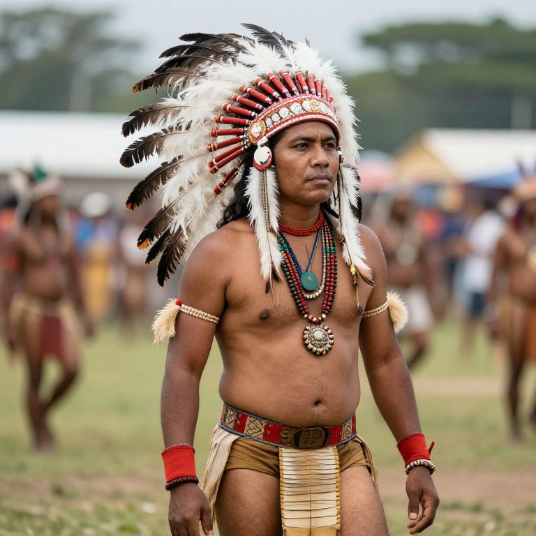 Male wearing a native headdress with feathers on his head and a necklace around his neck. He is also wearing a pair of shorts and a shirt with a belt.