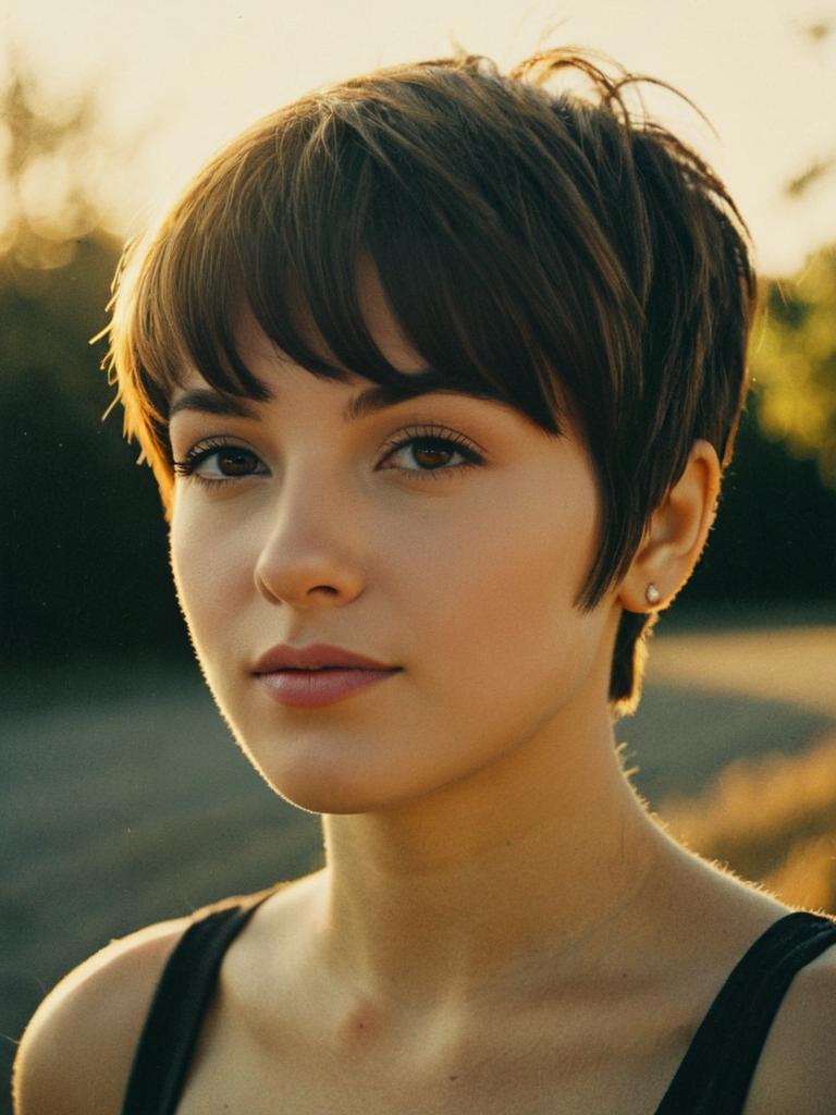 Woman with Pixie Haircut, photorealistic outdoor portrait, golden hour