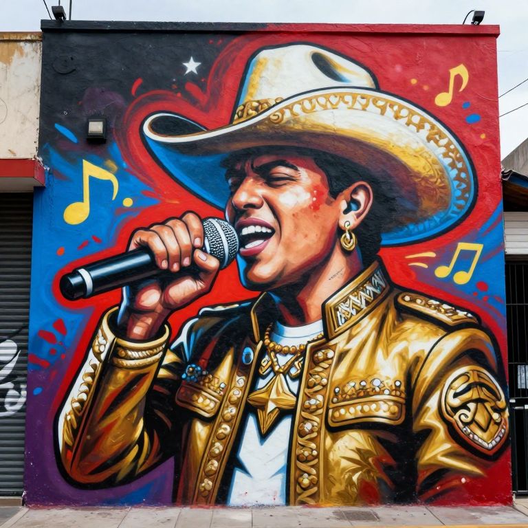 Vibrant mural of a smiling Latino man in a gold jacket and white cowboy hat singing into a microphone, surrounded by musical notes and a red heart