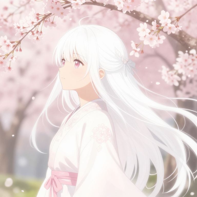 White anime girl sitting peacefully by a crystal-clear lake, wearing a white flowing dress, soft sunlight filtering through trees, delicate and ethereal background, painterly style