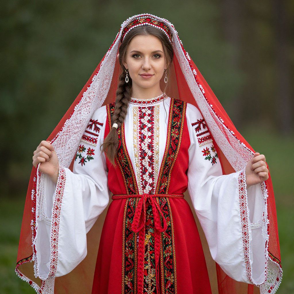 "Traditional Slavic Wedding Dress, woman in a traditional dress with a red and white veil"