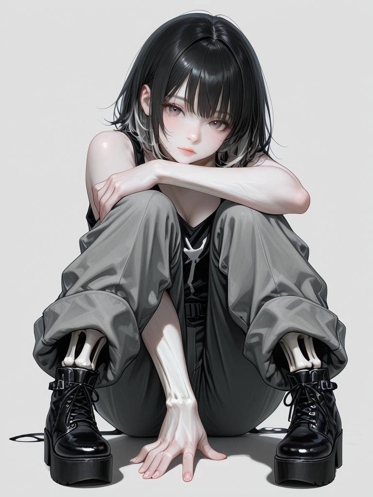 1girl, realistic face, full body shot, Woman, edgy, body-hugging full-length jumpsuit with a skeletal print in monochrome tones, sleeveless, scoop neckline, realistic bone detail from shoulders to ankles, paired with black platform ankle boots, plain white background.