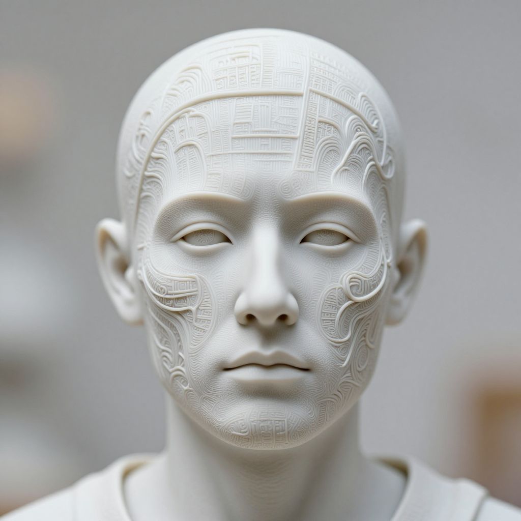 Typography portrait of a man, wired face, fractal, white porcelain, soft colors background bokeh, photorealistic, very detailed,