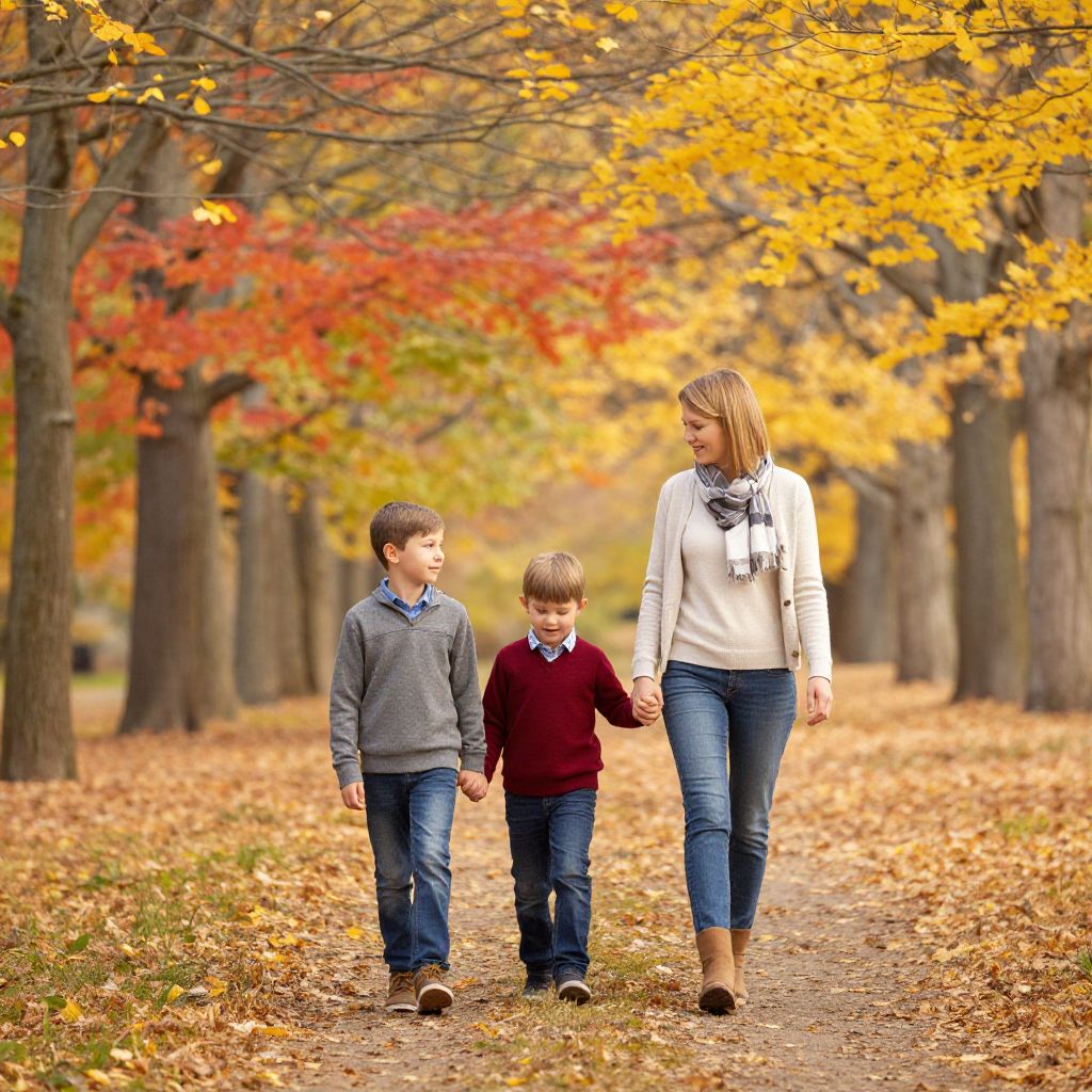 Family strolling through a picturesque autumn park, with vibrant fall foliage and golden leaves carpeting the path, as two boys hold hands and a woman walks alongside them, all radiating warmth and joy.