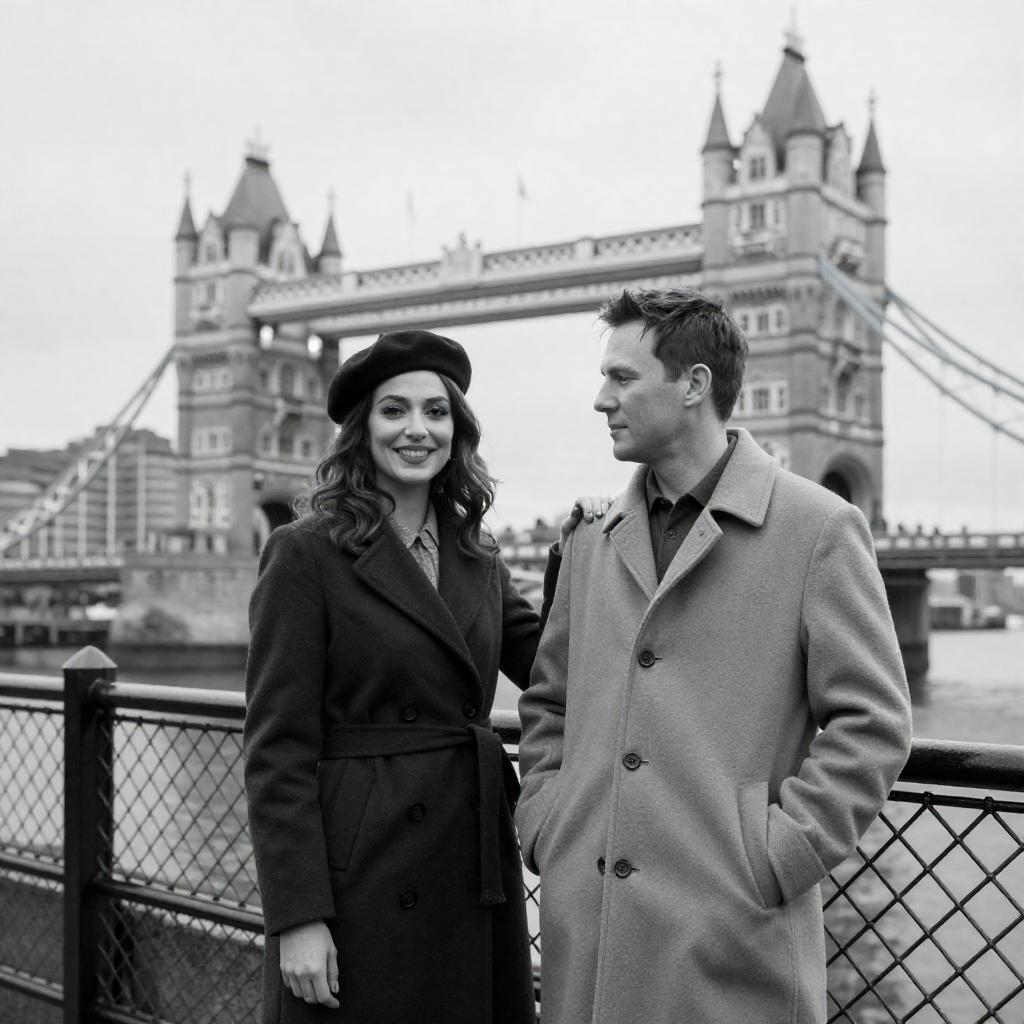 Black-and-white photograph of a man and woman standing in front of Tower Bridge. Woman with wavy hair, dark coat, and beret, smiling. Man with short dark hair, light coat, leaning on fence, looking at woman. Chain-link fence in foreground. Tall, pointed bridge towers in background. Woman's left hand on man's shoulder. Man's right hand in pocket. Woman's expression is confident, man's expression is neutral. Both facing camera.