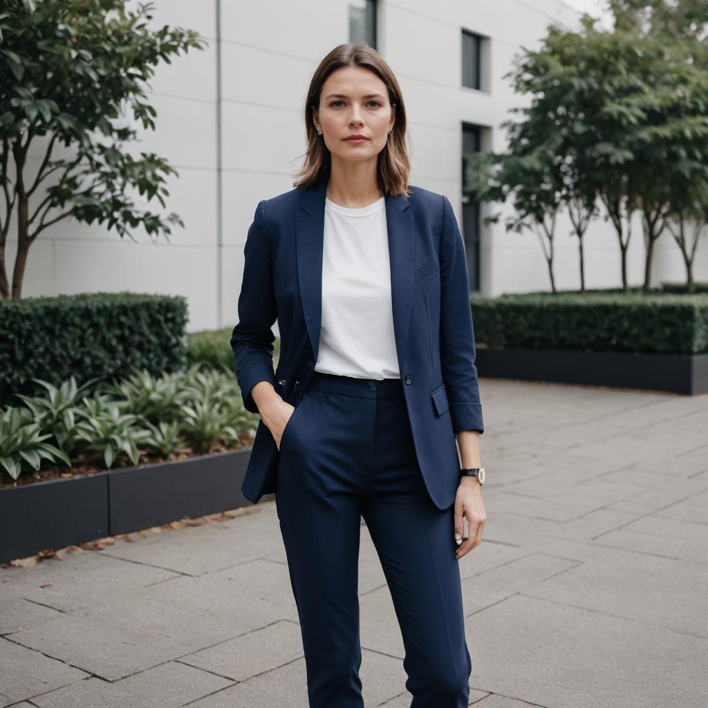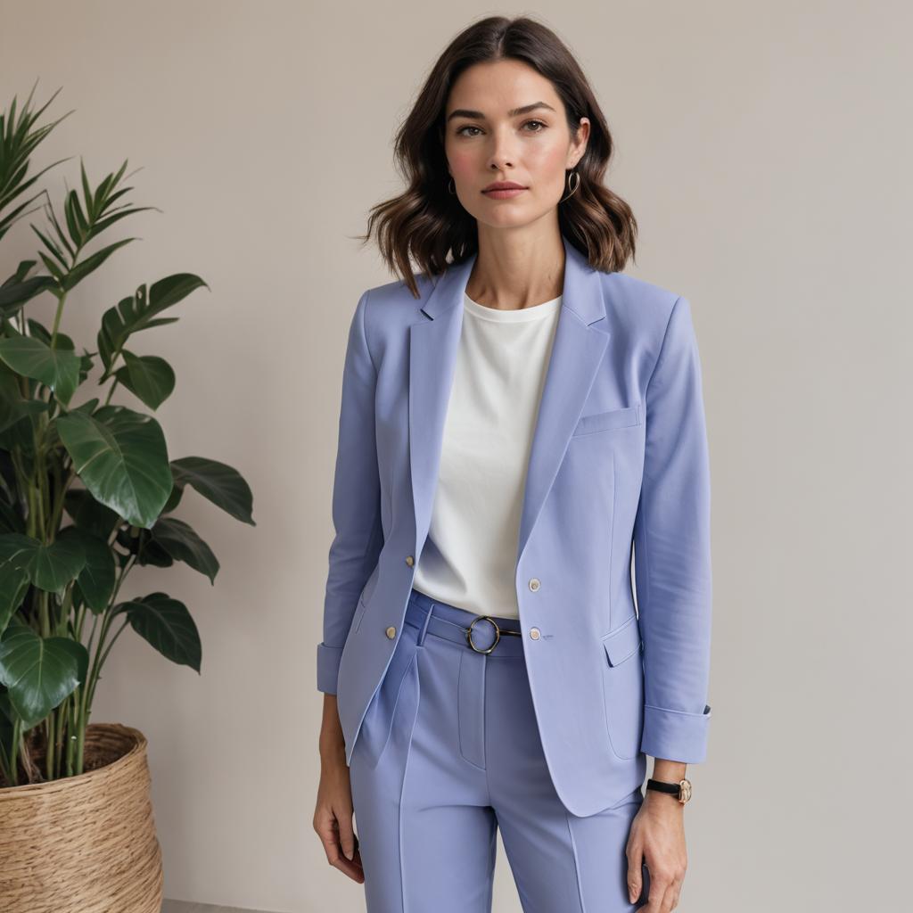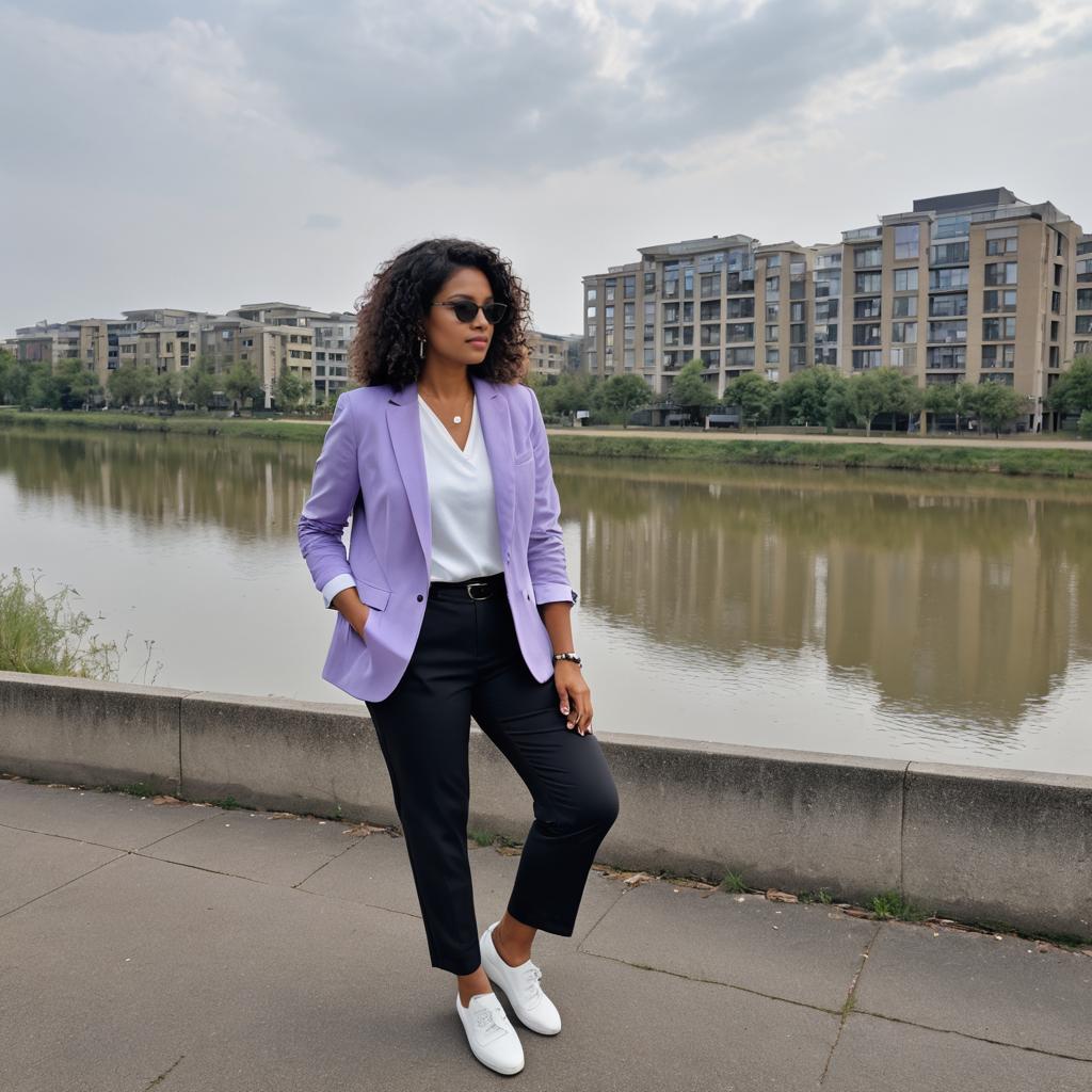 Confident Woman in Lavender Suit by Riverbank
