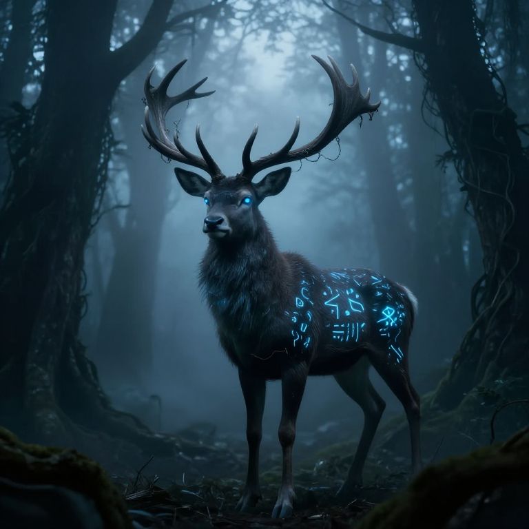 Digital artwork of a mystical, glowing deer standing in a foggy, dark forest. The deer has large, intricately branched antlers and glowing blue runes on its dark fur. Its eyes also emit a soft blue light. The forest is dense with tall, shadowy trees, creating a mysterious, ethereal atmosphere. The image uses a cool blue color palette, enhancing the magical and otherworldly feel. The deer is centered, facing slightly to the left, with mist swirling around its legs, adding depth and a sense of enchantment.