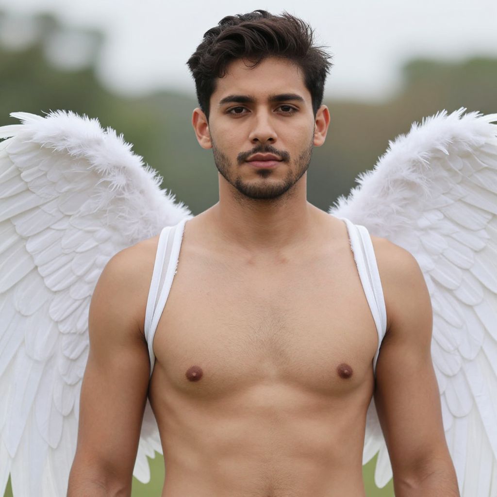 Photograph of a young, attractive man with medium brown skin and short, dark, slightly tousled hair. He has a trimmed beard and a neutral expression. He is shirtless, revealing a toned, muscular chest with small nipples. He wears white, feathery angel wings attached to a white strap across his shoulders. The background is blurry, with green and white hues, suggesting an outdoor setting. The overall composition emphasizes his angelic appearance. The image has a soft, natural light, enhancing the textures of his skin and feathers.