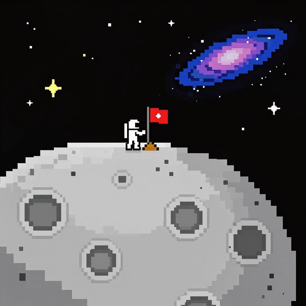 Pixel art space landscape featuring a pixel moon surface with craters, pixel astronauts planting a flag, distant pixel stars and a pixel galaxy, nostalgic 16-bit video game aesthetic