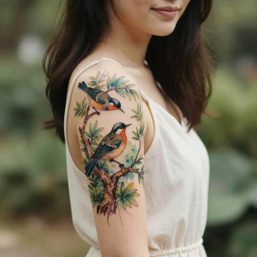 Upper sleeve tattoo woman, elegant sleeve tattoo inspired by nature, with birds and trees in watercolor style, serene background, soft pastel colors, gentle smile, outdoor garden setting, high detail illustration