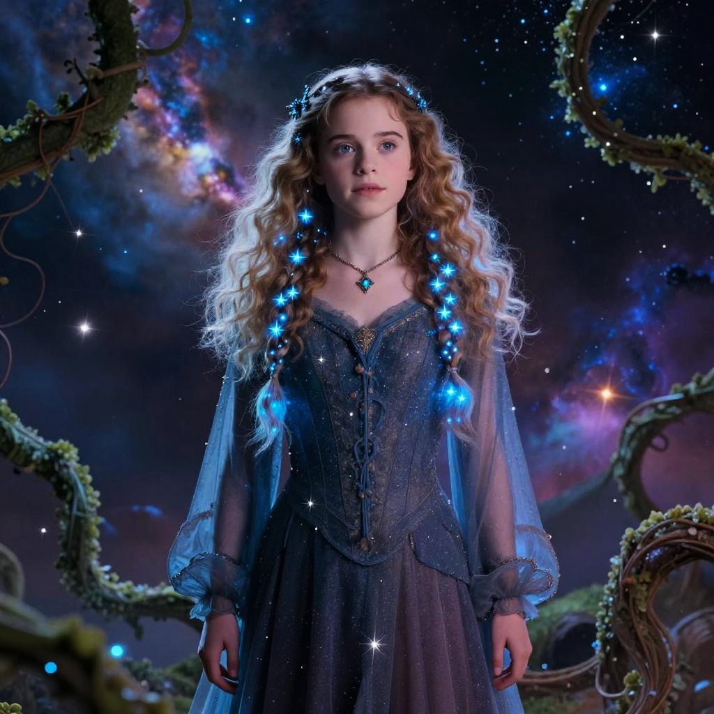 A whimsical, dream-like Hermione Granger depicted as a celestial figure, with twisting aurora braids, surrounded by sparkling arcane glyphs, standing in a glittering starfield canyon.