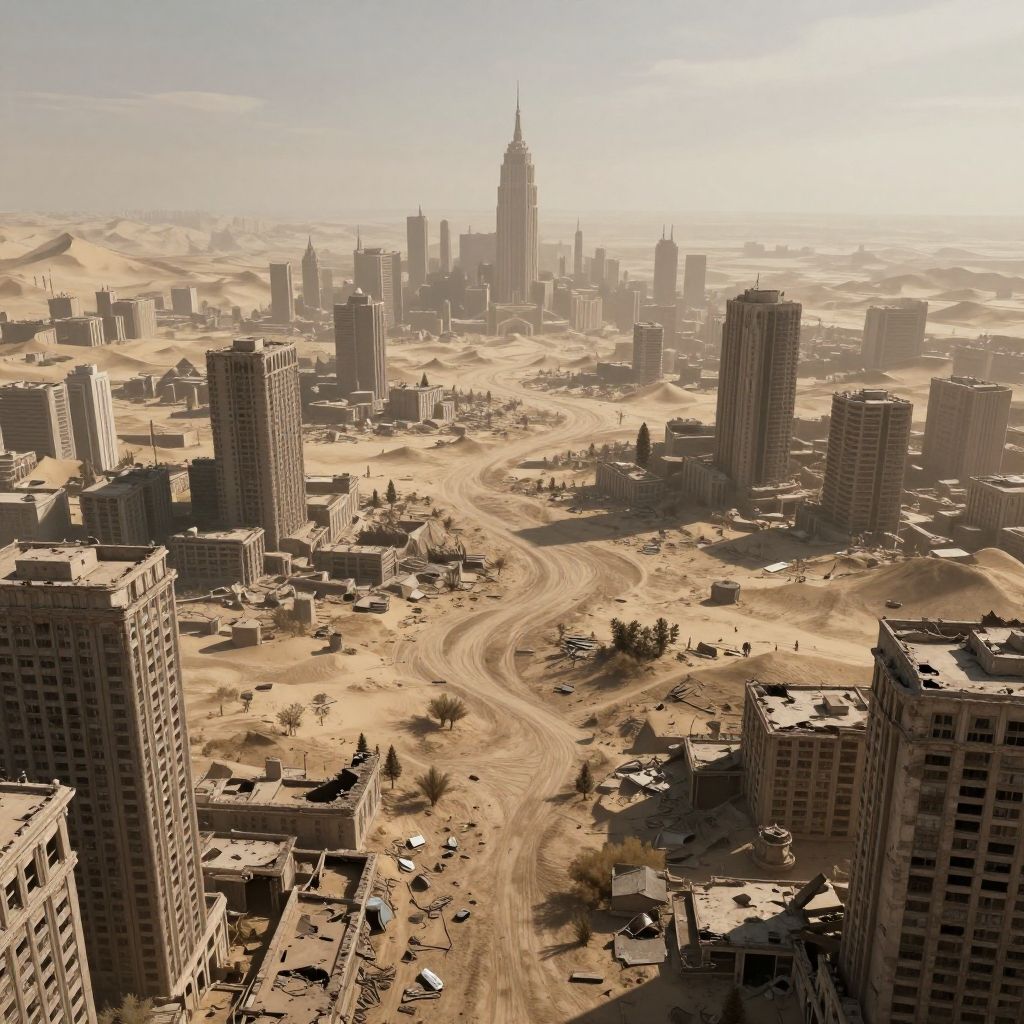 Aerial photograph of a desert city with tall, modern skyscrapers, winding roads, and sandy surroundings under bright sunlight. Urban oasis amidst arid