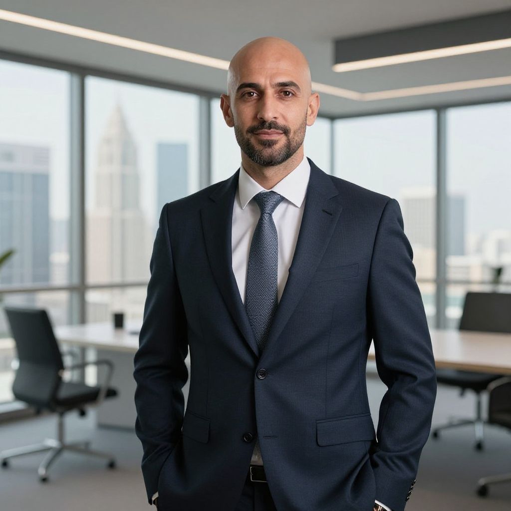 Photograph of a bald, bearded Middle Eastern man with a medium skin tone, standing in a modern office. He wears a dark blue, well-fitted suit with a white dress shirt and a dark blue patterned tie. The office has large windows with a cityscape view, and the room is brightly lit with fluorescent lighting. In the background, there are black office chairs and desks, creating a professional, contemporary workspace. The man looks directly at the camera with a neutral expression.
