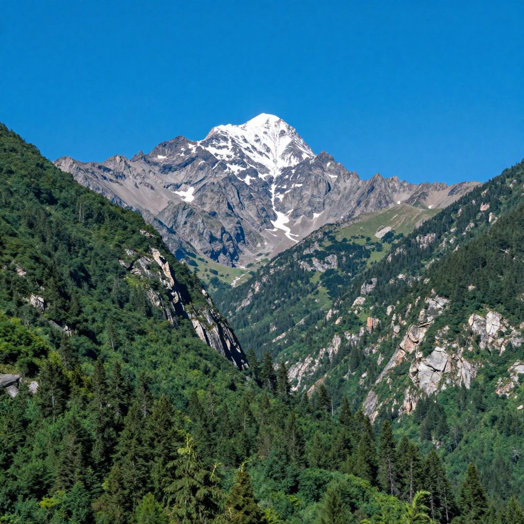 Cascade Mountain standing tall under a brilliant blue sky, surrounded by lush green forests and rocky cliffs, detailed landscape emphasizing its majestic height and rugged terrain, sunlight highlighting the mountain's snow-capped peak, ultra-realistic style.