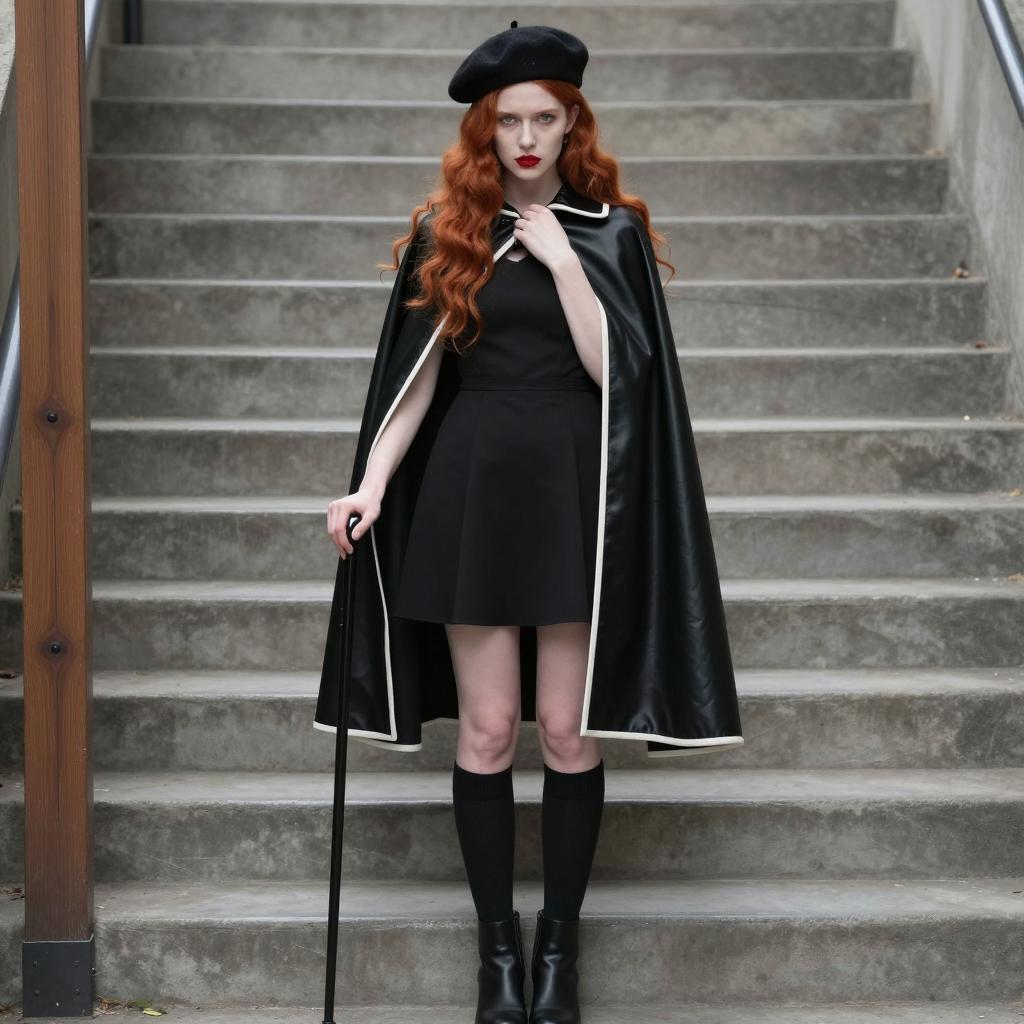 Woman with red hair, wearing gray dress, black leggings, and silver shoes, leans against red pillar in empty bowling alley. Wooden floor, two parallel bowling lanes, red and white lane dividers. Background: black and white checkered wall, three bowling balls. Dim lighting, muted colors. Woman's face not visible.